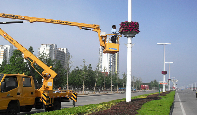 輕型伸縮臂高空車更換照明路燈施工現(xiàn)場…